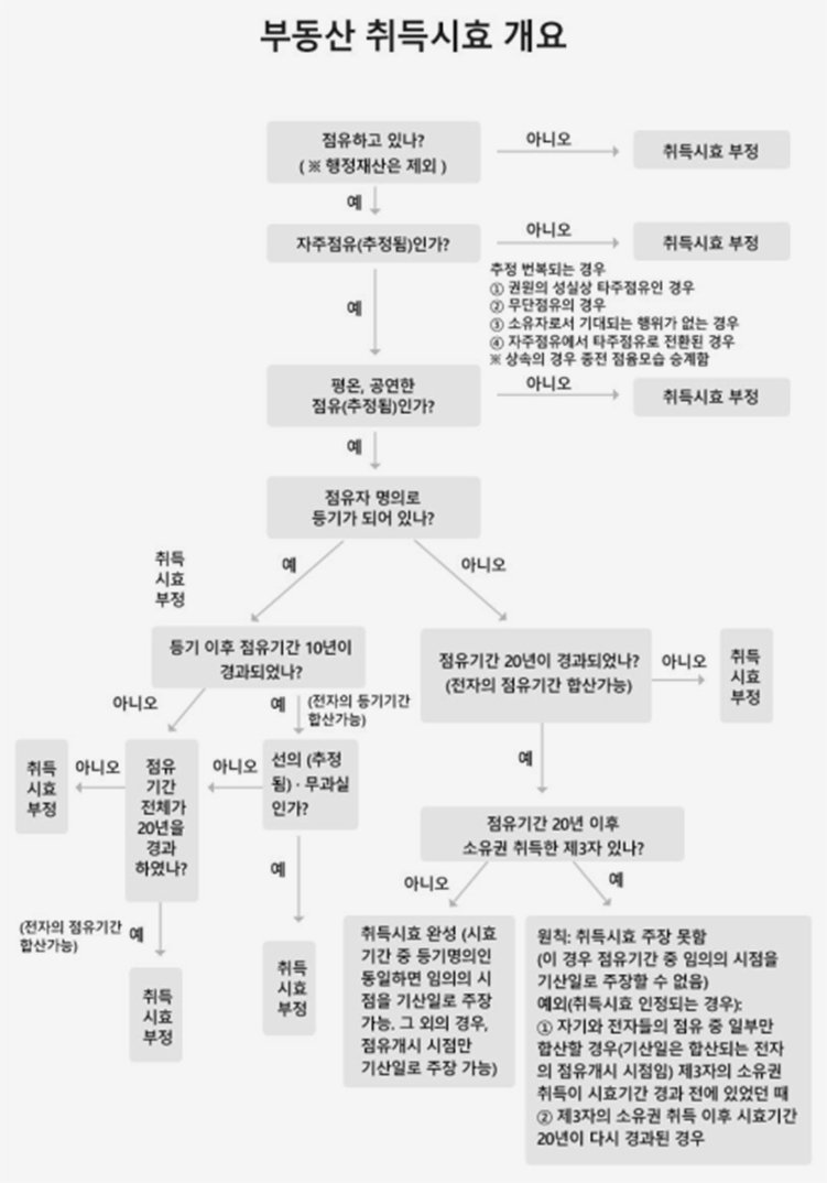- 통상 지방의 경우 미등기 된 건축물이 다수 존재하고, 지적현황이 불분명한 경우도 많으며, 또한 오랜 기간 동안 거주한 것을 이유로 자신의 소유권을 주장하는 등 취득시효와 관련된 분쟁이 다수 발생합니다. 취득시효와 관련하여 주로 고려할 사항은 아래의 도표와 같습니다.