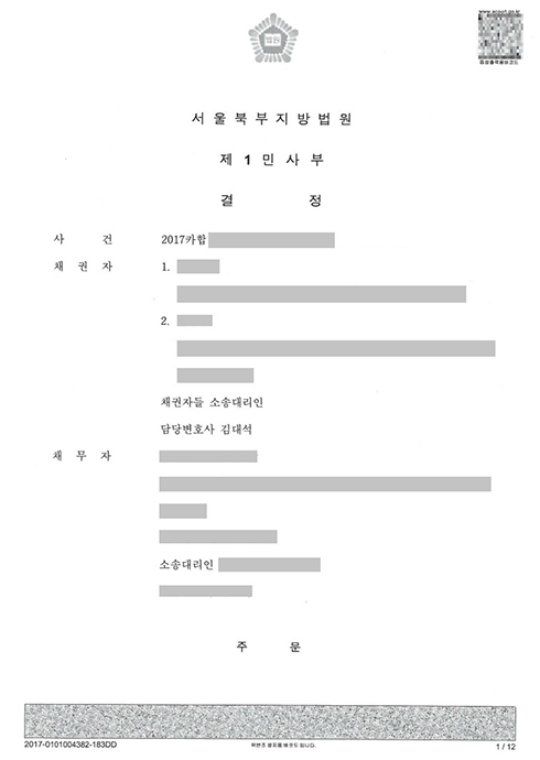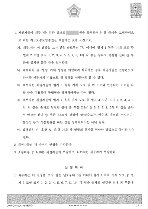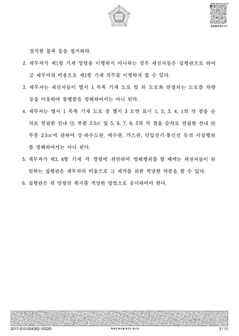 이에 수원변호사 법률사무소 재인은 해당 주택부지에 신축된 주택에 차량이 통행하기 위해서는피고 지역주택조합 소유의 도로를 통하지 않고서는 통행할 수 없고, 해당 신축 주택은 법정 주차면적을 충족하여주차 시설을 해 놓았고, 신축 목적 자체가 근린생활시설 및 주택으로 차량의 통행이 필수적이며,해당 지역주택조합의 사업 자체가 표류중에 있어 추후 진행될 가능성이 희박하는 점,원고가 지역주택조합 소유의 도로를 이용하더라도 실제 지역주택조합에 경미한 손해만이 가해질 뿐이라는 점,원고에게는 민법 제219조 주위토지통행권이 인정된다는 점을 주장하여 지역주택조합 소유의 사도를 통해통행방해행위를 금지한다는 가처분 결정을 이끌어 내어 공사 및 준공이 지연되지 않고 원하던 바대로컨테이너와 볼라드를 철거 및 이동하게 하는 만족스러운 결과를 이끌어 내었습니다.통행방해금지가처분_페이지_01.jpg)