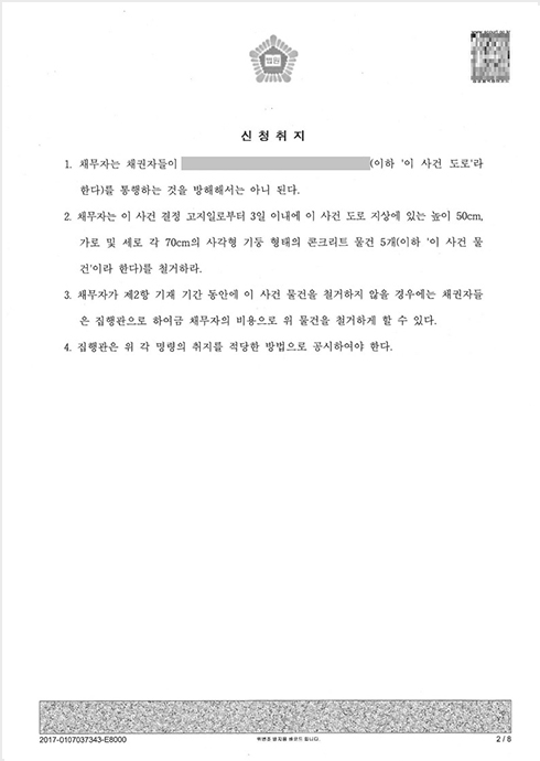 이에 A사는 B의 공사차량통행을 금지하기 위해 경계물을 설치하기에 이르렀고, B는 A사의 행위가 교통방해행위라며 법원에 통행방해금지가처분을 신청하였습니다.